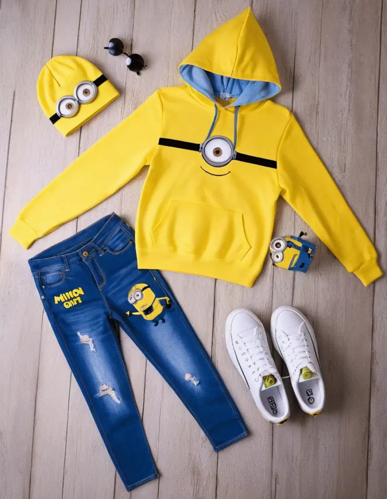 Minion Hoodie and Jeans – A yellow hoodie with printed Minion eyes pairs well with jeans for a casual outfit.