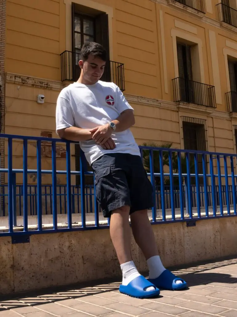 Tan cargos and a light gray tee bring warmth and balance to the Blue Tint palette.