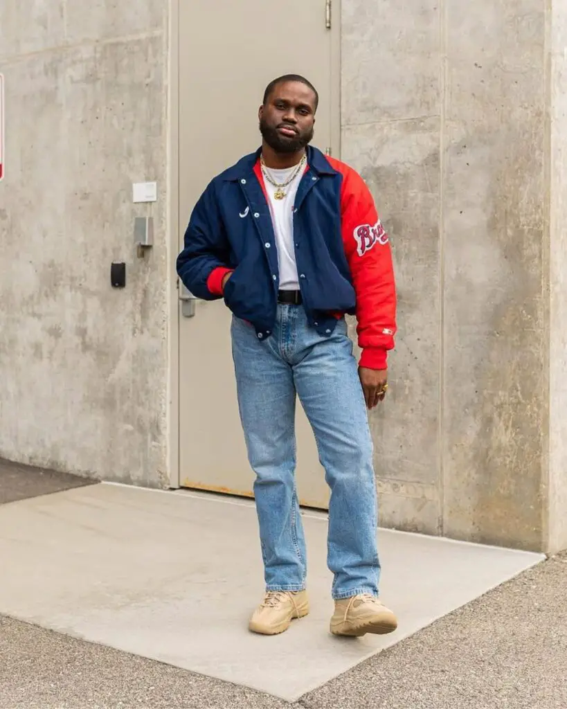 Light-wash jeans and a denim jacket contrast beautifully with earthy Yeezy tones.