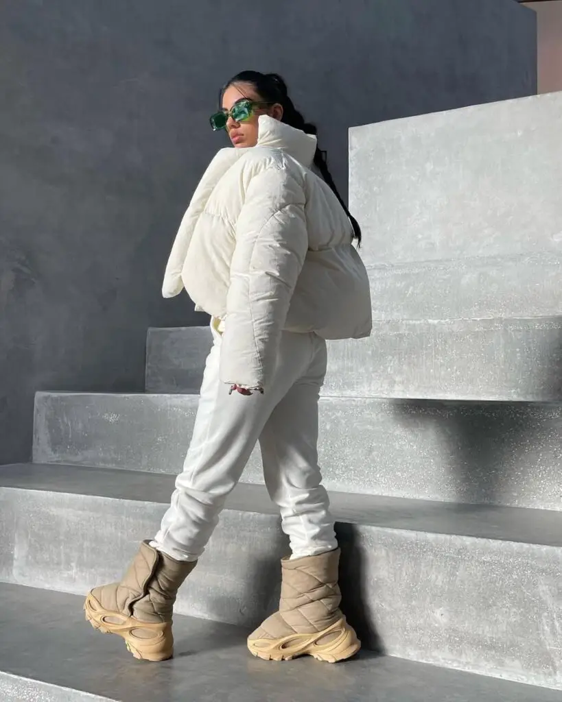 A stone-colored tracksuit complements tan or sand Yeezy Boots perfectly.