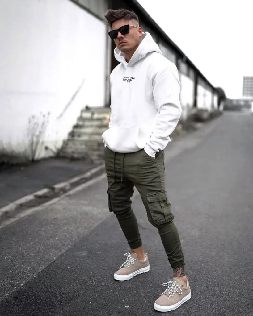 9. Olive Cargo Pants & White Long Sleeve Tee