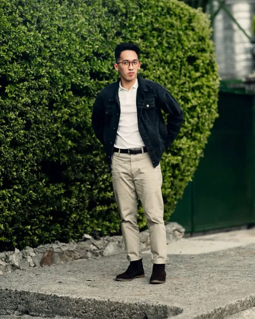 15. Black Denim Jacket & Tan Trousers