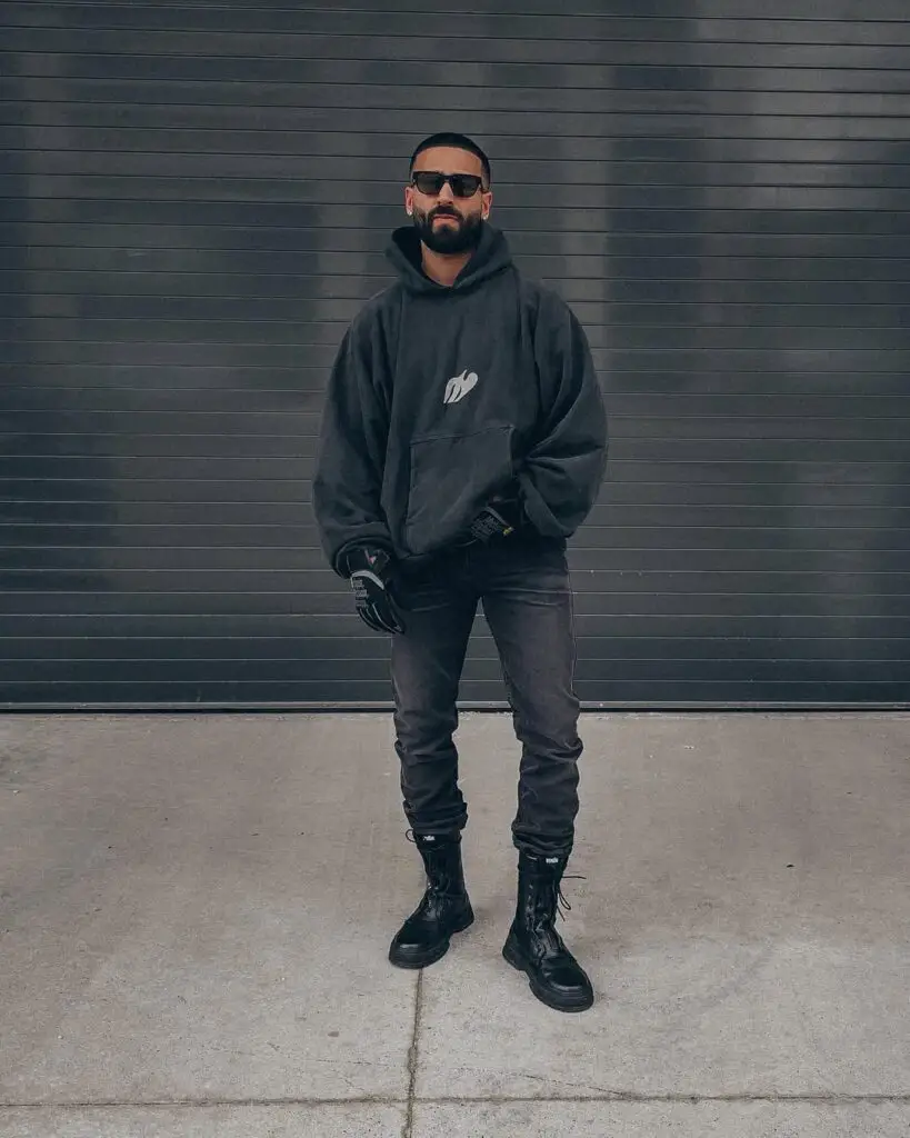 Keep it edgy with a black hoodie and distressed grey jeans — a streetwear staple combo.