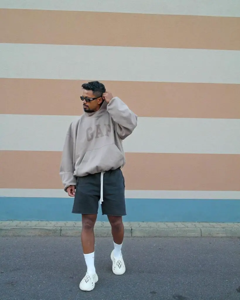 For warmer days, go with a loose hoodie and beige shorts — casual yet elevated.