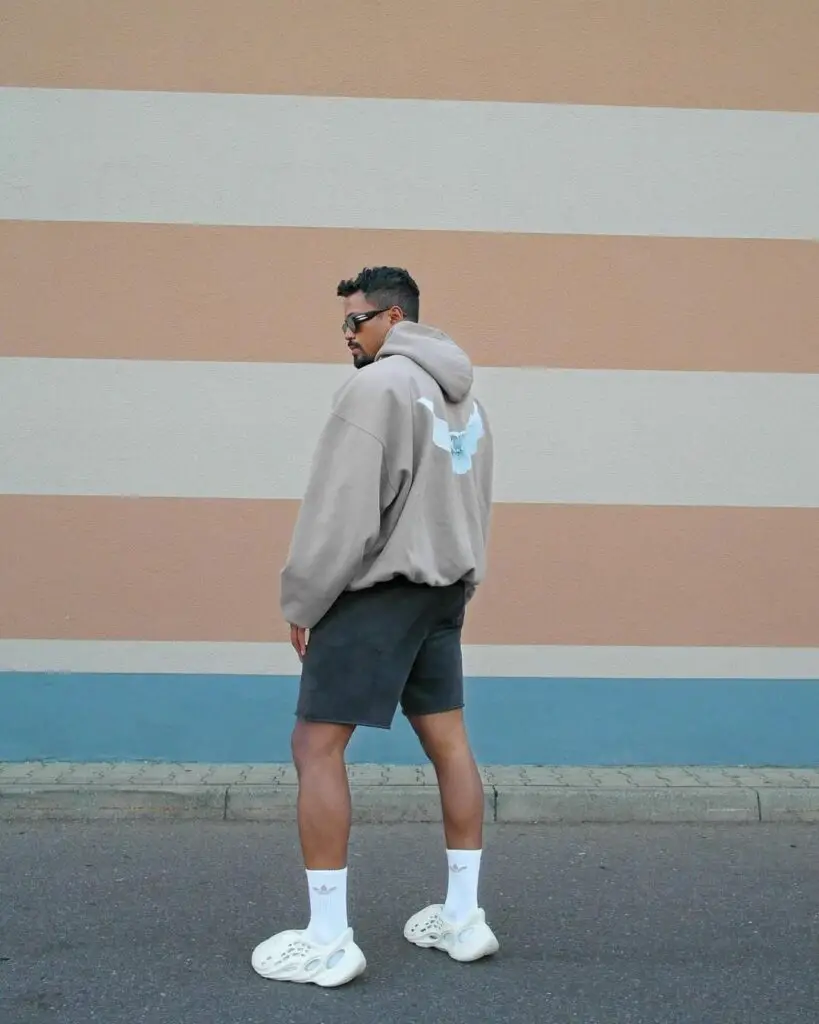 Finish your look with a beige hoodie, joggers, and Yeezy slides for a relaxed minimalist style.
