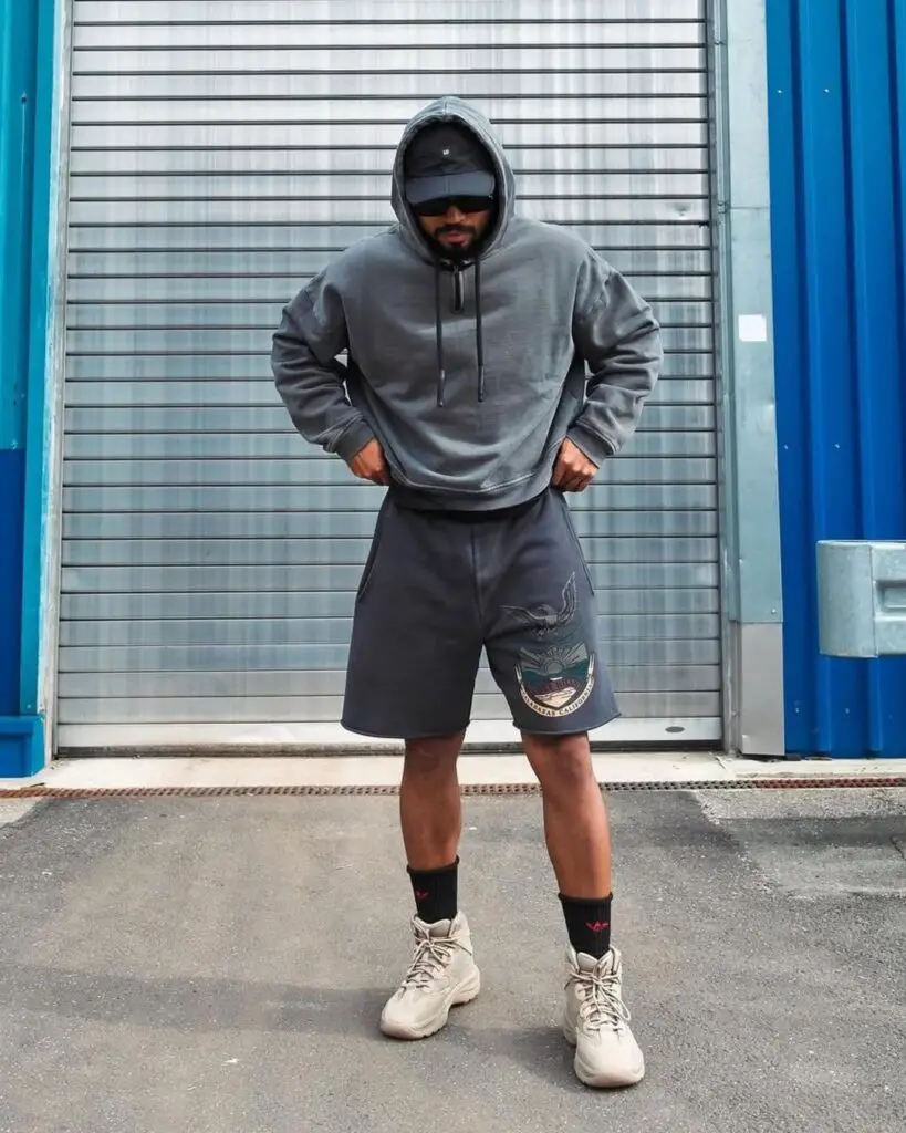 Cargo shorts and a loose sweatshirt paired with Yeezys give a perfect travel-ready outfit.