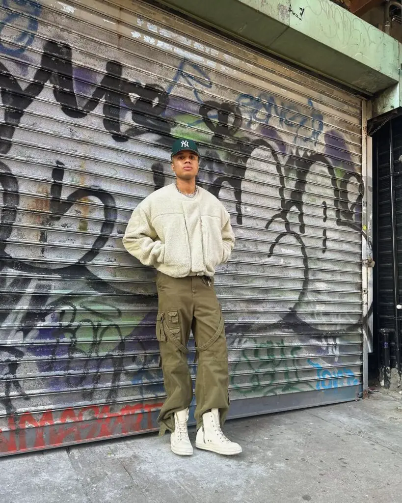 Try an oversized crewneck sweater and cargo pants paired with Yeezy boots for rugged fashion.