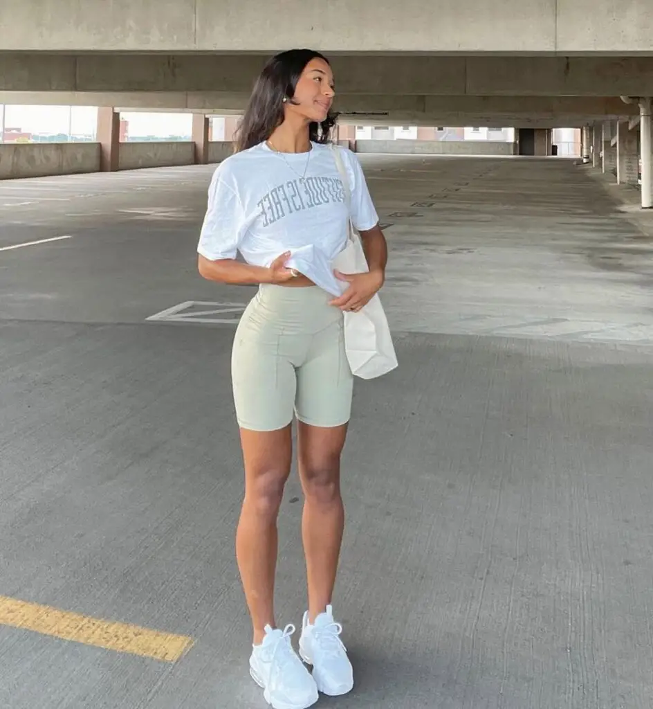Graphic Tee & Biker Shorts – Channel effortless athleisure energy by styling a bold graphic tee with biker shorts and Yeezy shoes for a balanced casual fit.