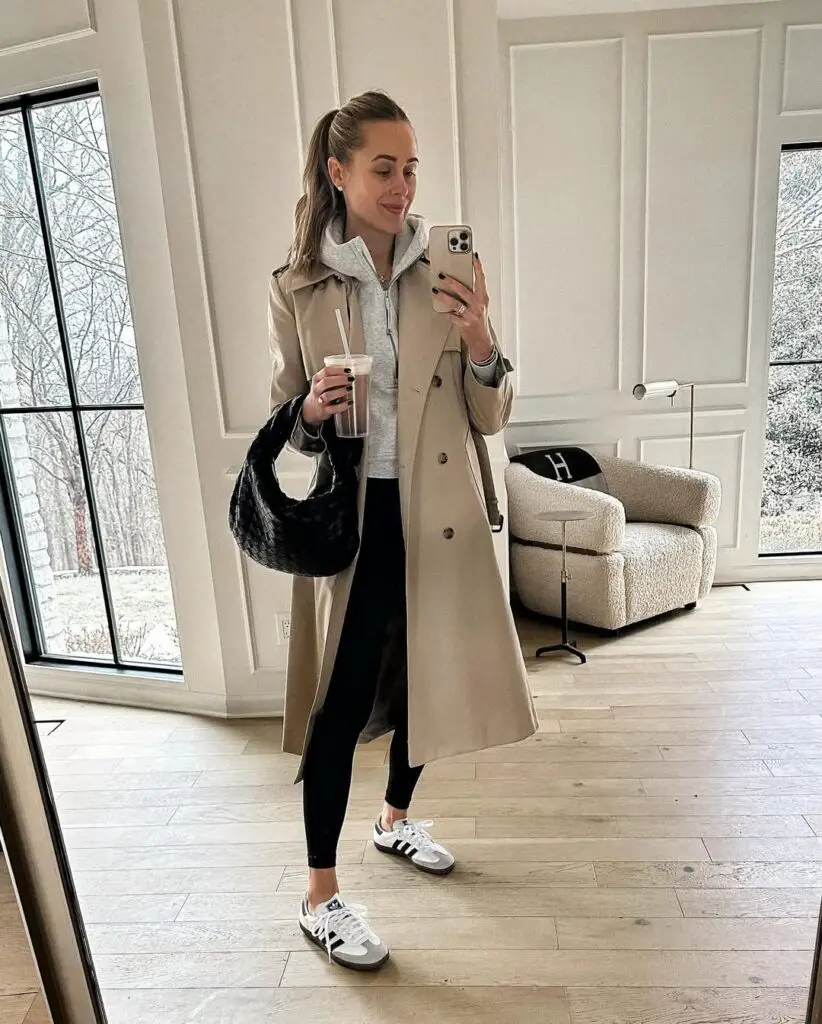 Long Coat & Leggings – A structured coat over leggings and Yeezys gives an off-duty model aesthetic.
