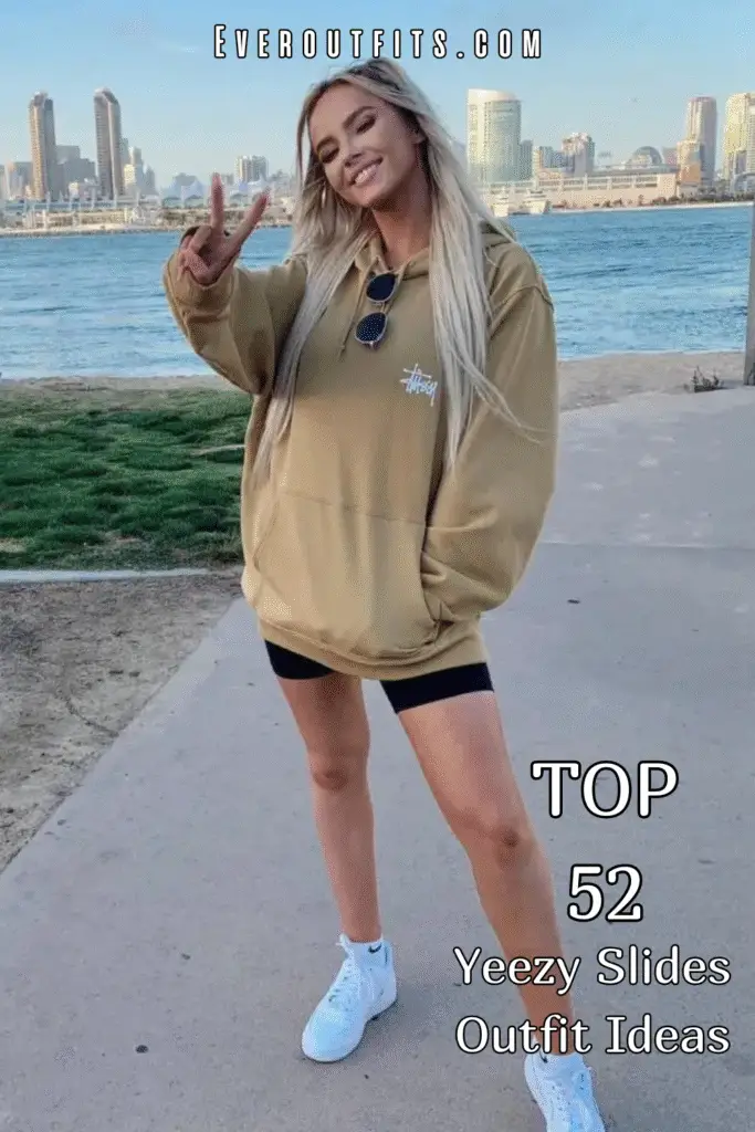 Oversized Hoodie & Biker Shorts – Pair your Yeezy slides with a cozy oversized hoodie and biker shorts for that effortless athleisure vibe. This look from the 52+yeezy slides outfit ideas list is ideal for laid-back weekends.