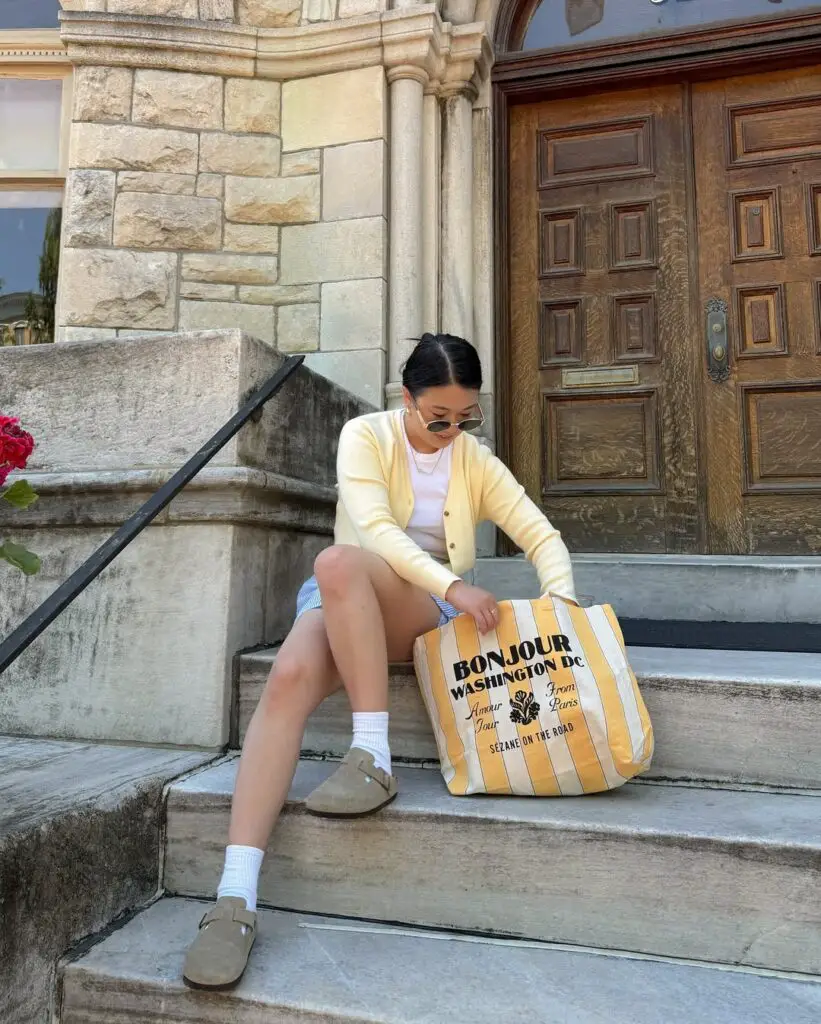 Pair a yellow tote with joggers and a graphic tee.