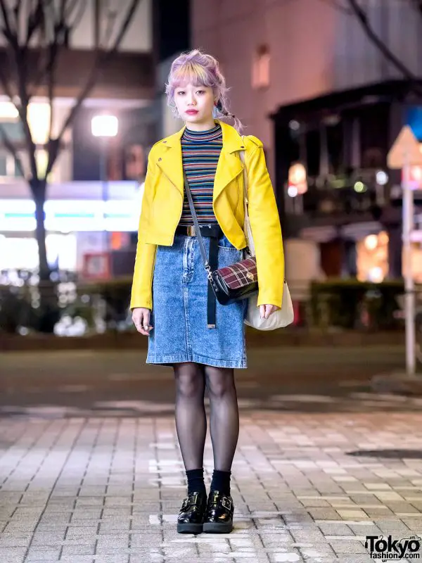 A denim skirt styled with a yellow coat gives off a youthful and trendy appeal. Sneakers make this outfit casual yet cool.