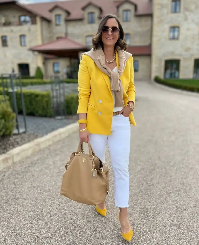 Brighten your day with white jeans topped with a yellow coat. This look screams fresh and modern.