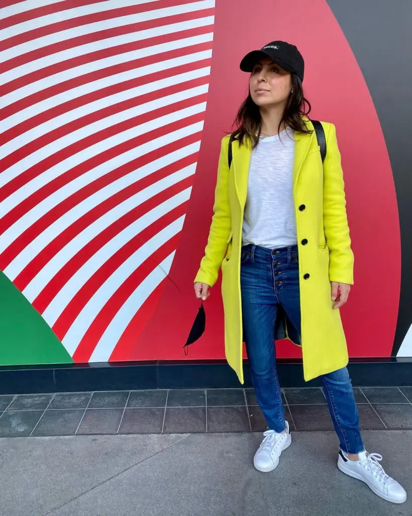 For chilly weather, accessorize your yellow coat with a knit beanie and scarf. It’s both cozy and stylish.